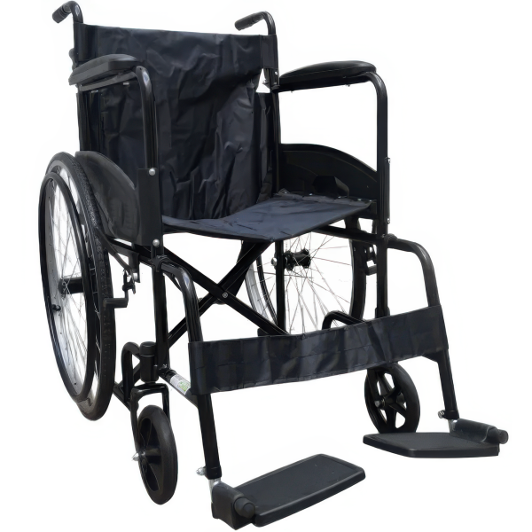 Silla de ruedas con estructura fija y desmontable. Cuenta con asiento y respaldo de nylon, descansabrazos fijos equipados con cojín de vinil para mayor confort, y una banda de soporte para pies también en nylon. Incluye además un cinturón de seguridad en el asiento para garantizar la protección del usuario.